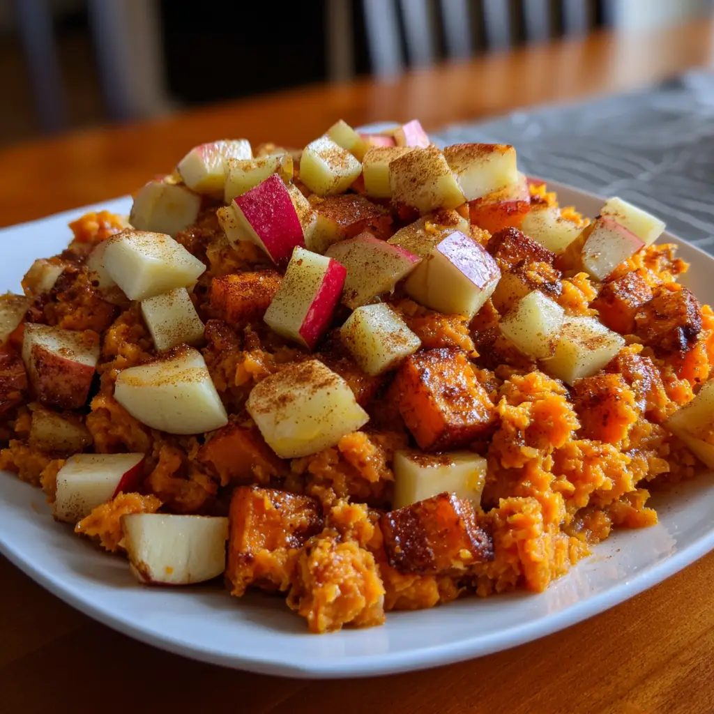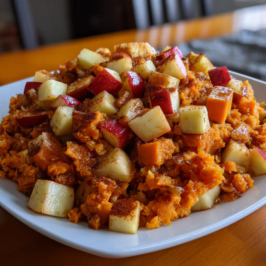 A warm and comforting dish made with roasted sweet potatoes, apples, and a hint of cinnamon, perfect for fall.