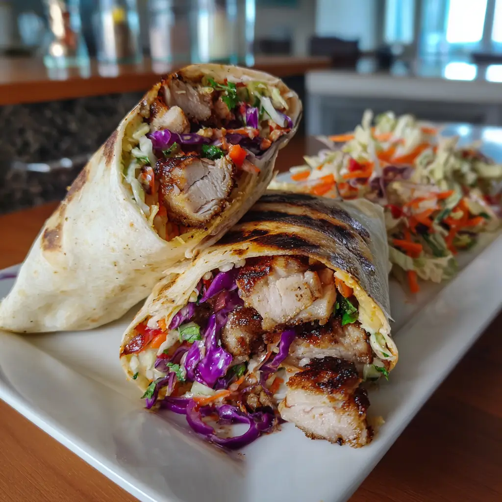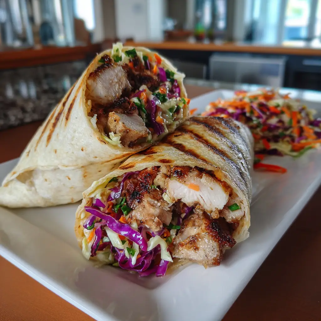 A delicious wrap filled with grilled chicken and a crunchy Asian slaw, perfect for a quick meal.