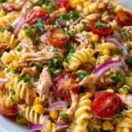 A vibrant pasta salad featuring tender chicken, fresh vegetables, and a smoky BBQ sauce, perfect for summer gatherings or cozy nights in.