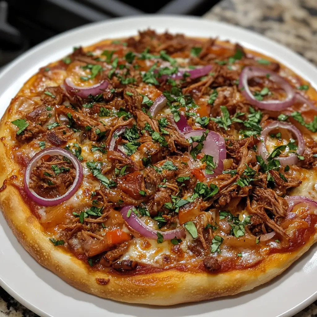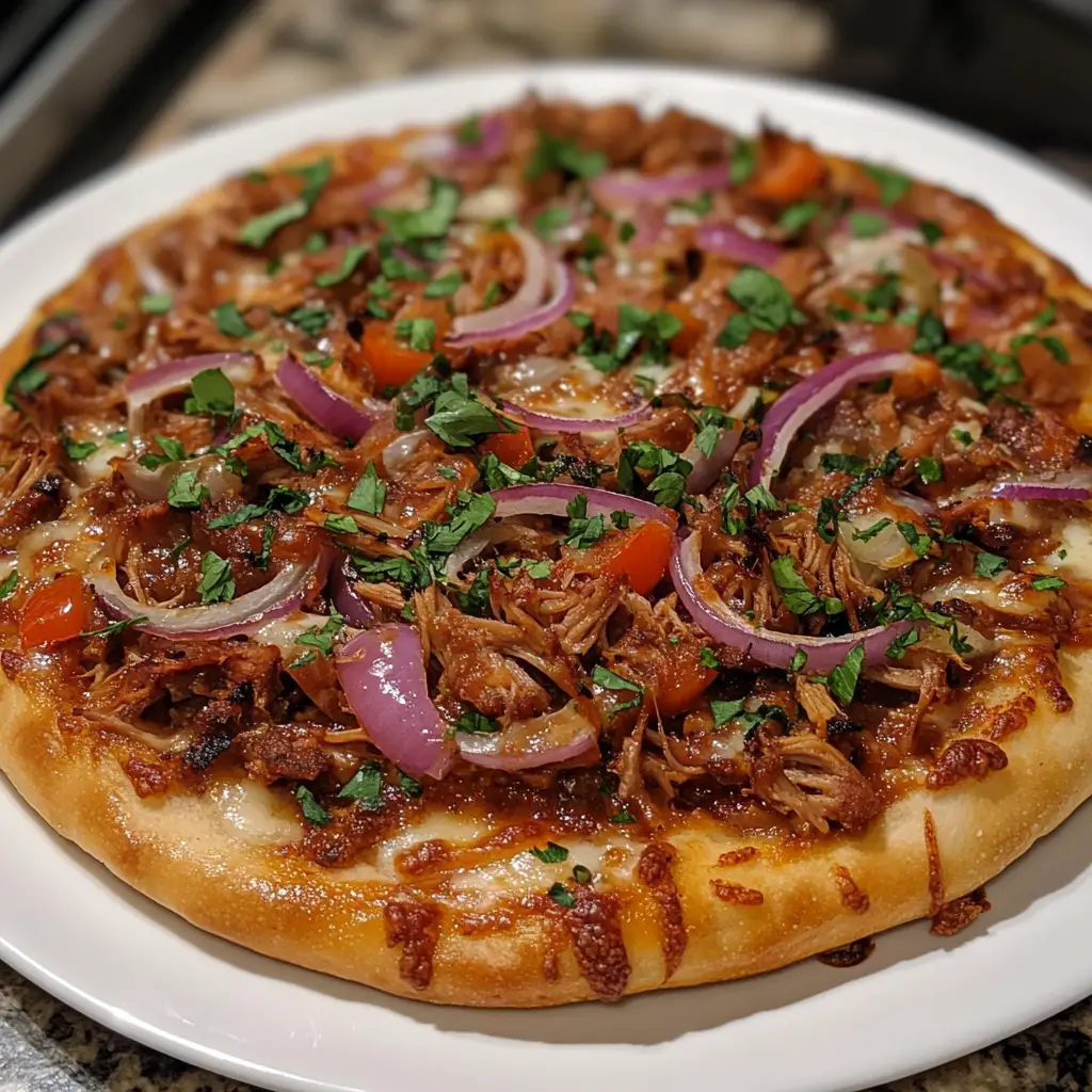 BBQ Pulled Pork Pizza is a delicious fusion of smoky pulled pork, tangy barbecue sauce, and melted cheese on a crispy crust, perfect for any pizza lover.