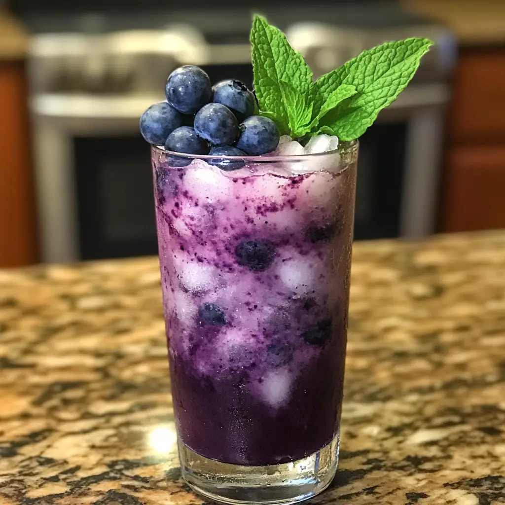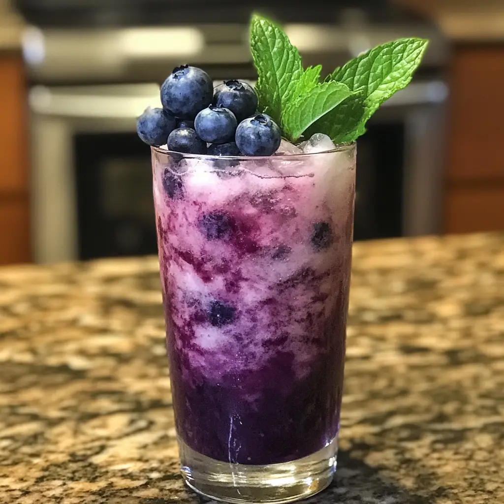 Skewer a few fresh blueberries and a small lime slice on a cocktail pick or toothpick and rest it on the rim of the glass. Add a sprig of fresh mint and a sprinkle of toasted coconut flakes for a final touch of elegance. Serve immediately with a straw, and encourage your guests to stir the layers together before drinking to enjoy the full flavor harmony.