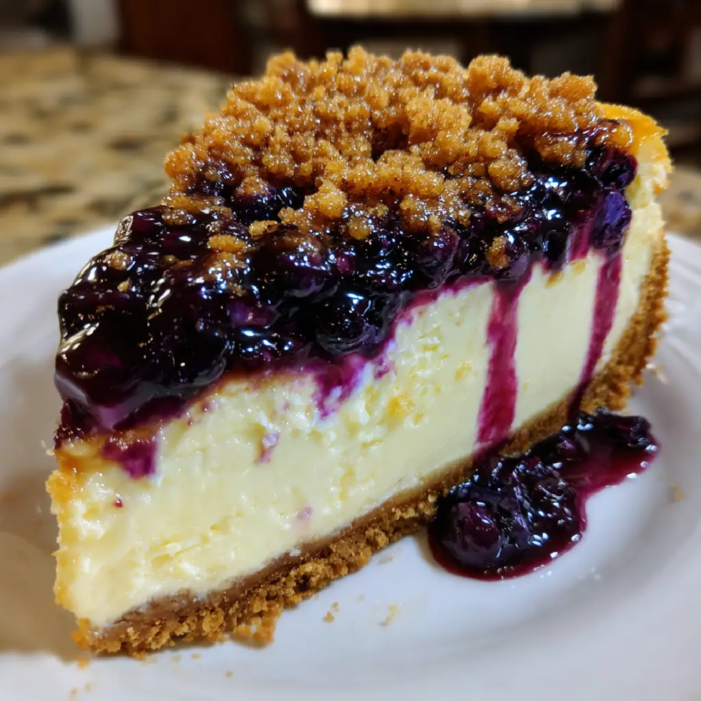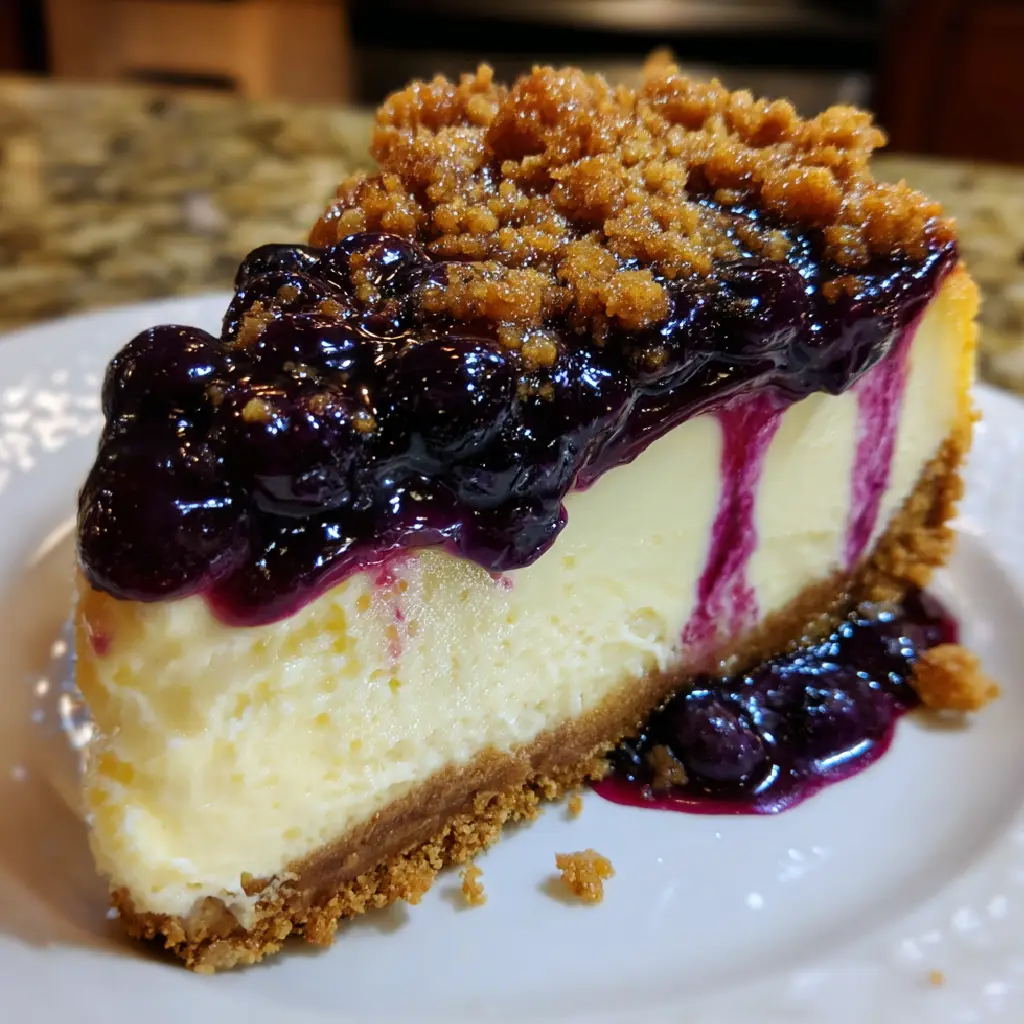 A delightful dessert combining creamy cheesecake with a blueberry topping and a crunchy crumble.