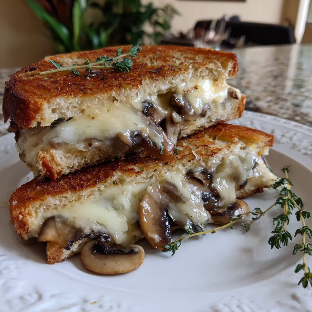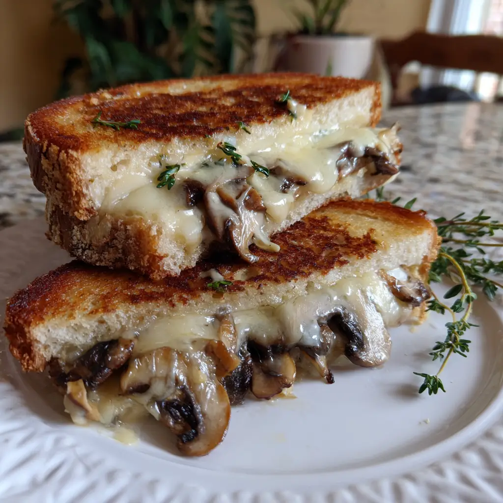 A delicious and indulgent grilled cheese sandwich featuring creamy brie cheese and savory mushrooms, perfect for a comforting meal.