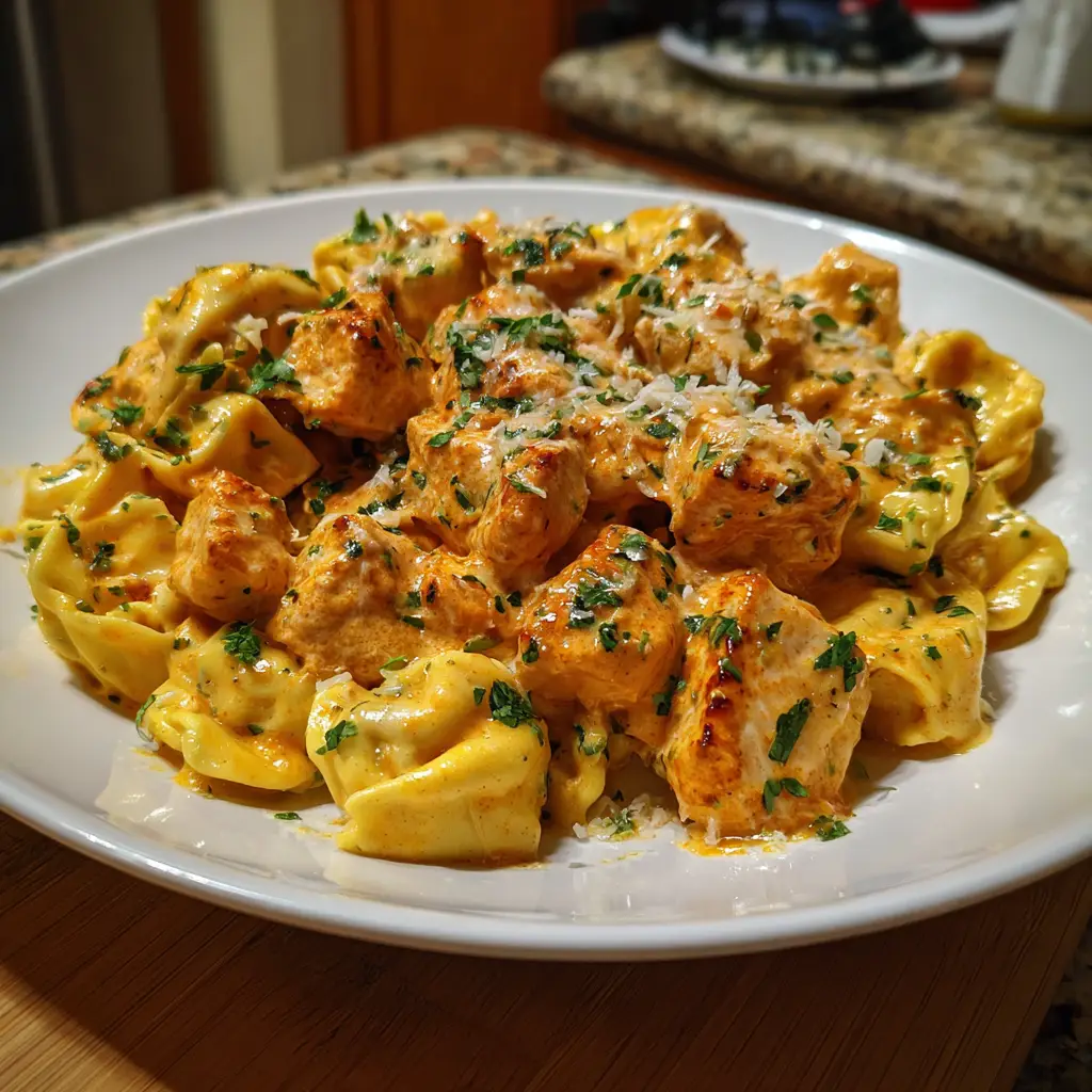 Buffalo Chicken Tortellini Alfredo is a creamy and spicy pasta dish that combines tender tortellini with shredded buffalo chicken and a rich Alfredo sauce, creating a flavor explosion in every bite.