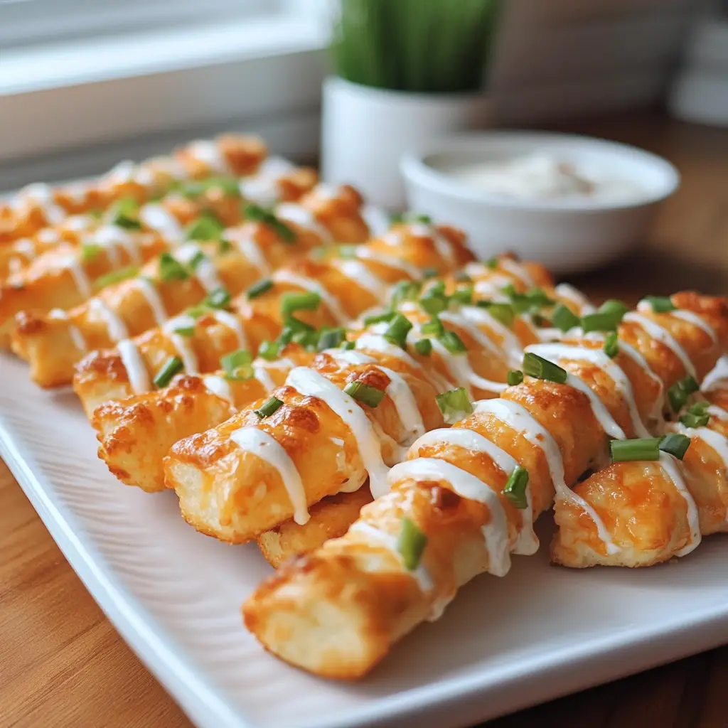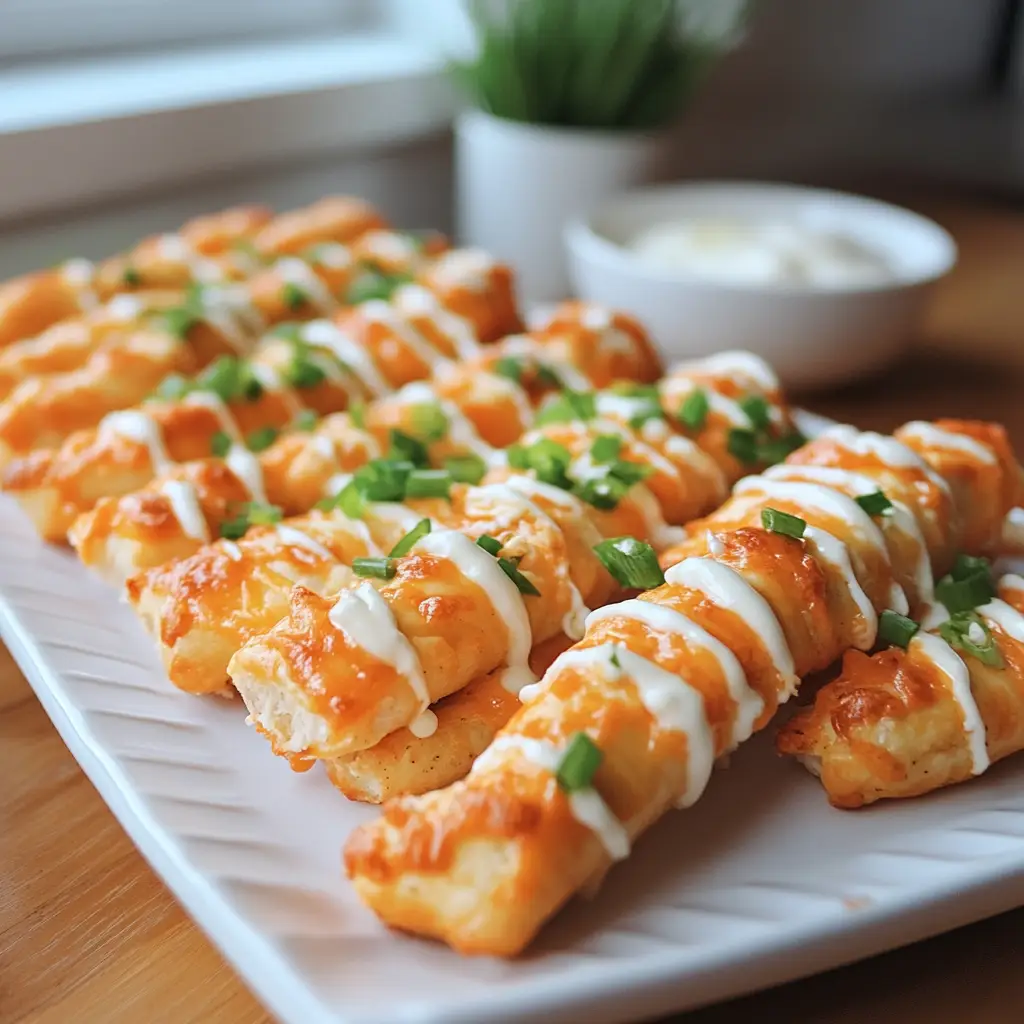 Delicious and cheesy breadsticks filled with spicy buffalo chicken, perfect for a snack or appetizer.