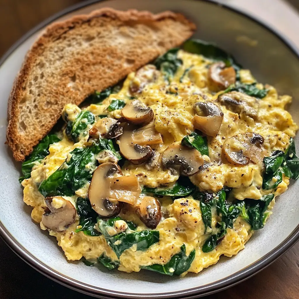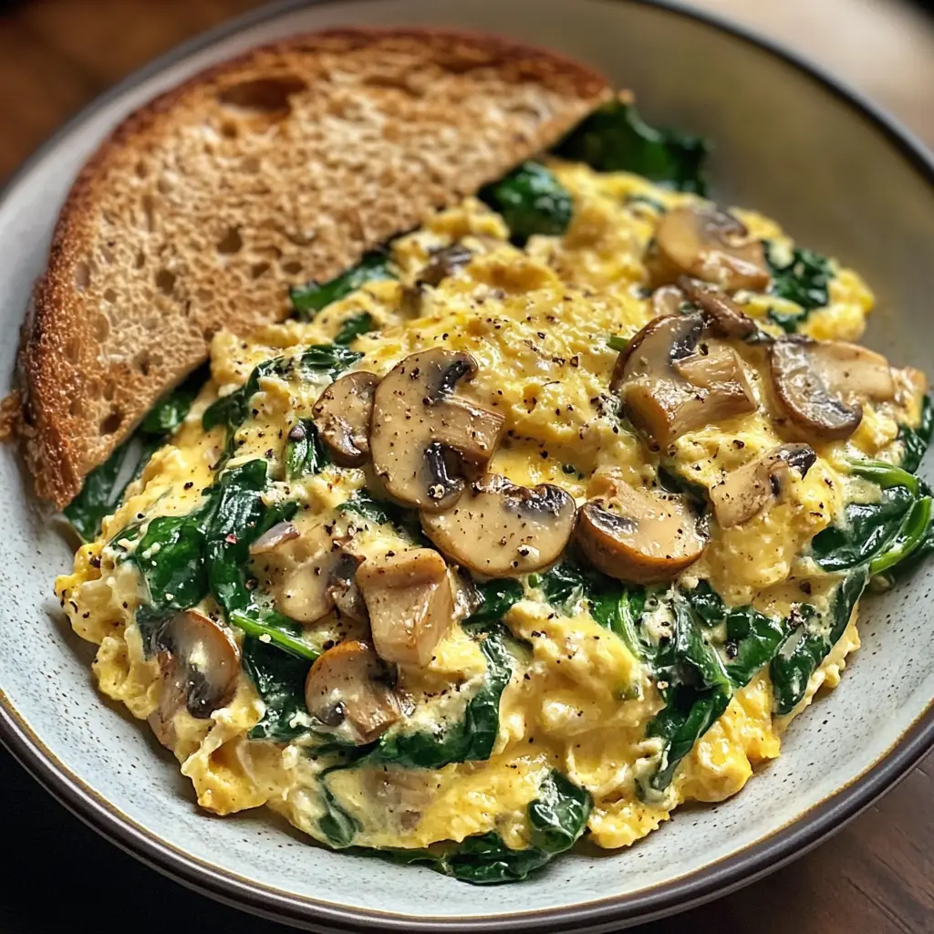 A delicious and nutritious breakfast scramble featuring cheesy spinach and mushrooms, perfect for starting your day.