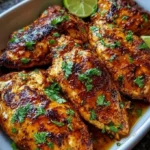 Delicious serving of Chili Lime Chicken garnished with lime and cilantro