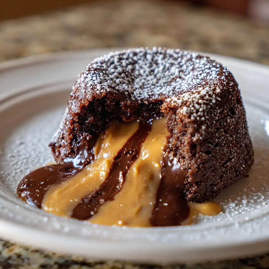 A rich and decadent dessert that combines the flavors of chocolate and peanut butter, featuring a gooey lava center.