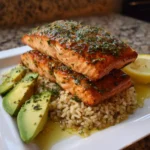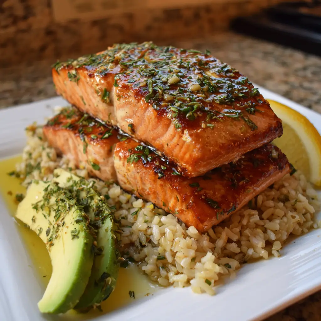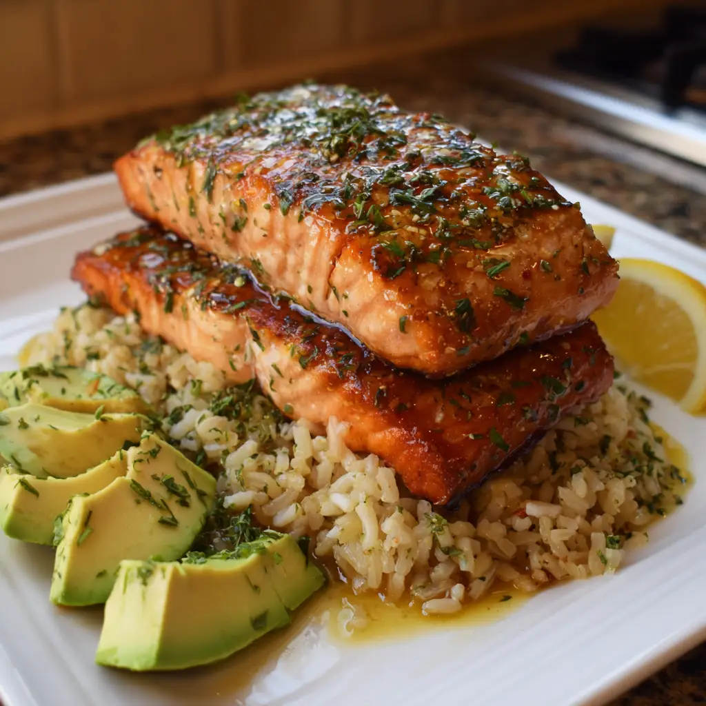 Now for the fun part! Spoon the fluffy brown rice onto plates and top it with the baked salmon. Drizzle any remaining marinade over the top for an extra burst of flavor. Garnish with a sprinkle of fresh herbs if you like. Your Citrus Herb Salmon & Brown Rice Stack is ready to impress!