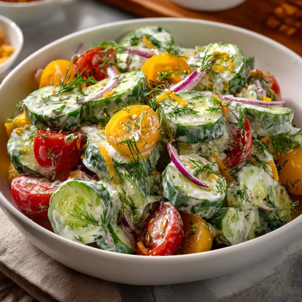 A refreshing and delicious salad featuring cucumbers and a creamy ranch dressing, perfect for summer gatherings.