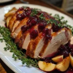 A deliciously glazed turkey breast featuring a sweet and tangy cranberry apple sauce, perfect for holiday feasts.