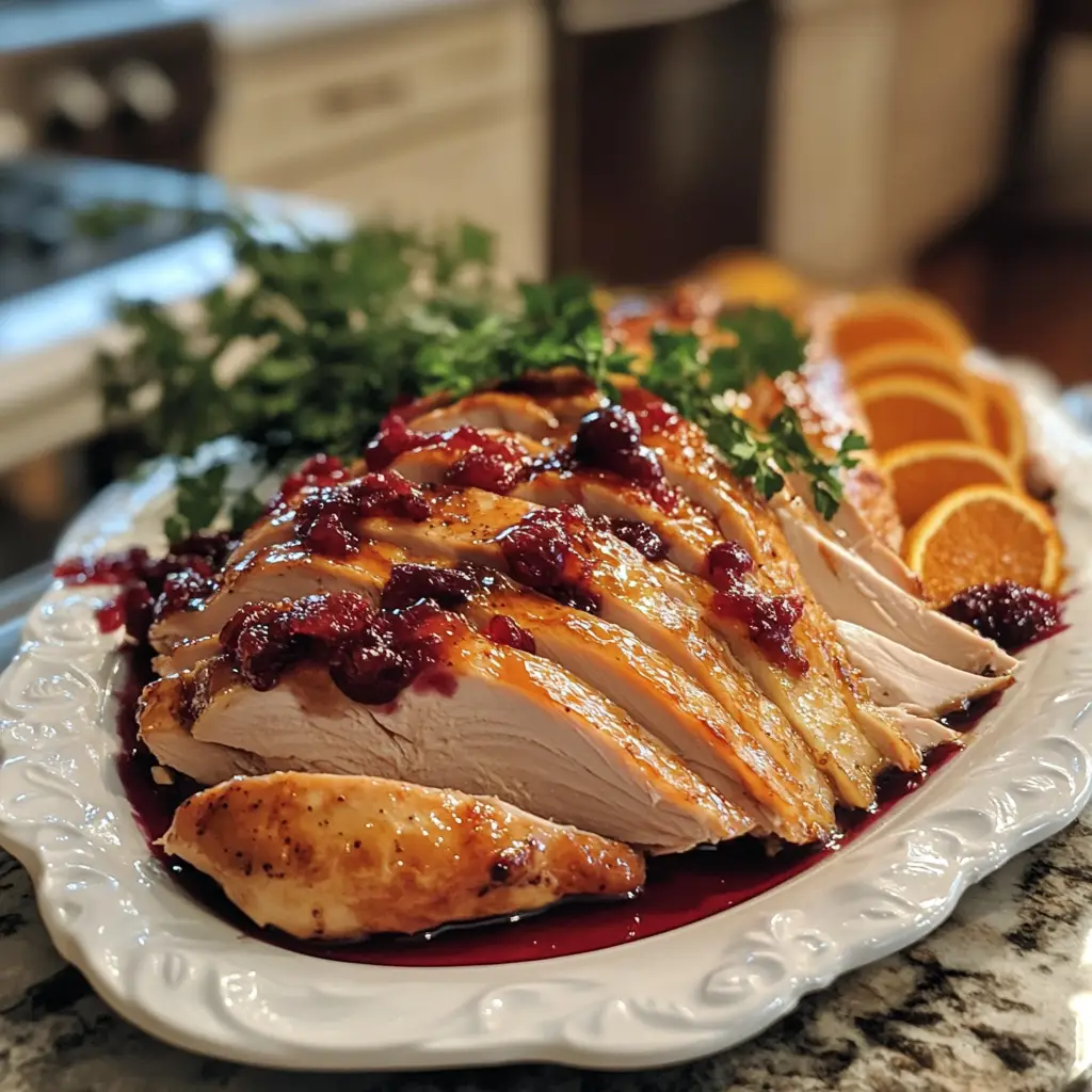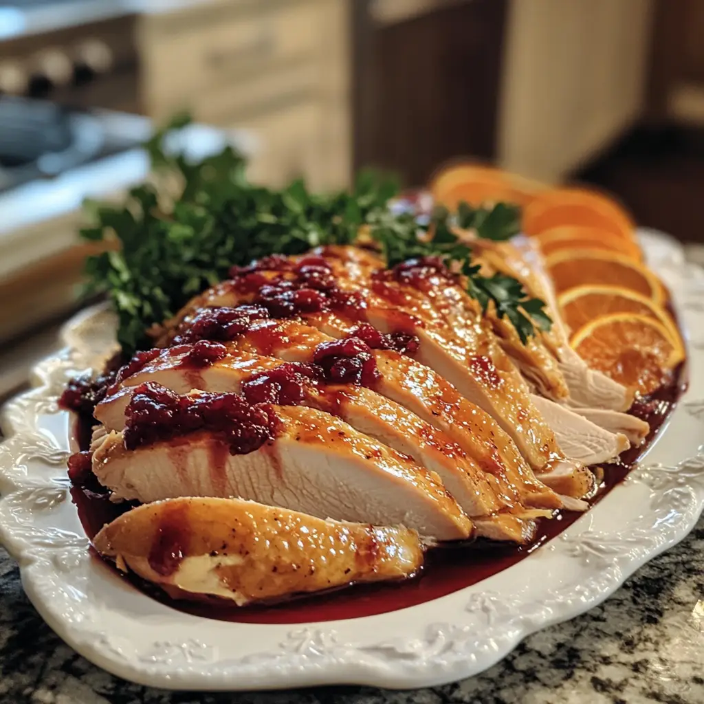 A delicious and festive turkey breast glazed with a sweet and tangy cranberry orange sauce, perfect for holiday gatherings.