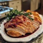 Now it’s time to brush the glaze onto the turkey breast. Place the turkey in a roasting pan and use a basting brush to apply the glaze generously all over. Make sure to cover every inch for even flavor. Don’t be shy—this glaze is what makes the turkey shine! If you have extra glaze, save it for basting during roasting.