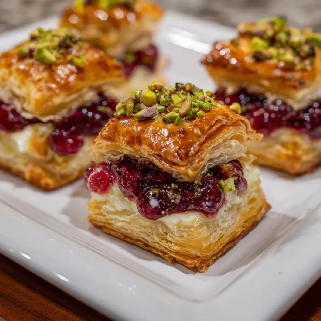 Cranberry Pistachio Brie Bites in Puff Pastry are a delightful appetizer featuring creamy brie cheese, tart cranberry sauce, and crunchy pistachios wrapped in flaky puff pastry.