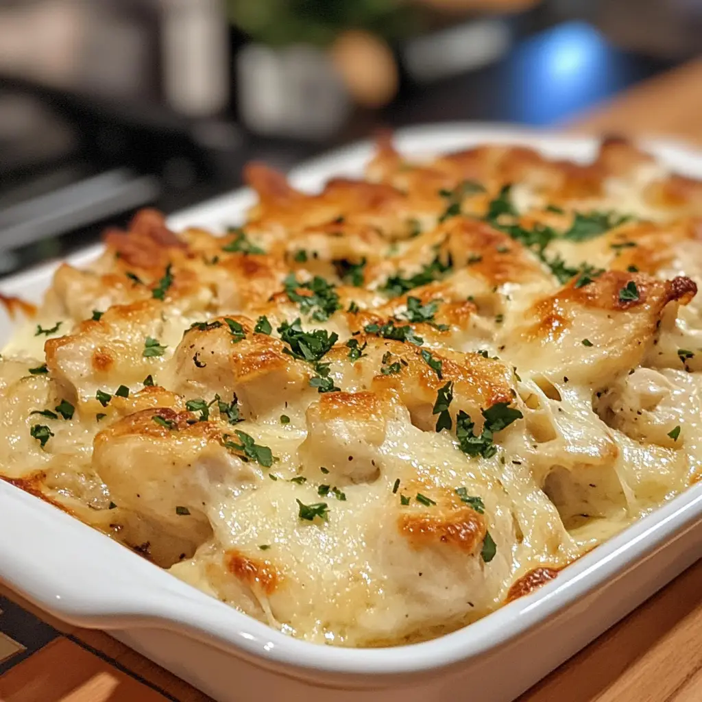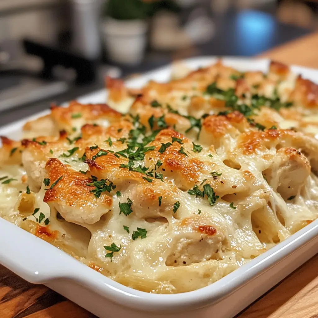 A delicious and creamy chicken bake made with Alfredo sauce, perfect for a comforting dinner.