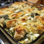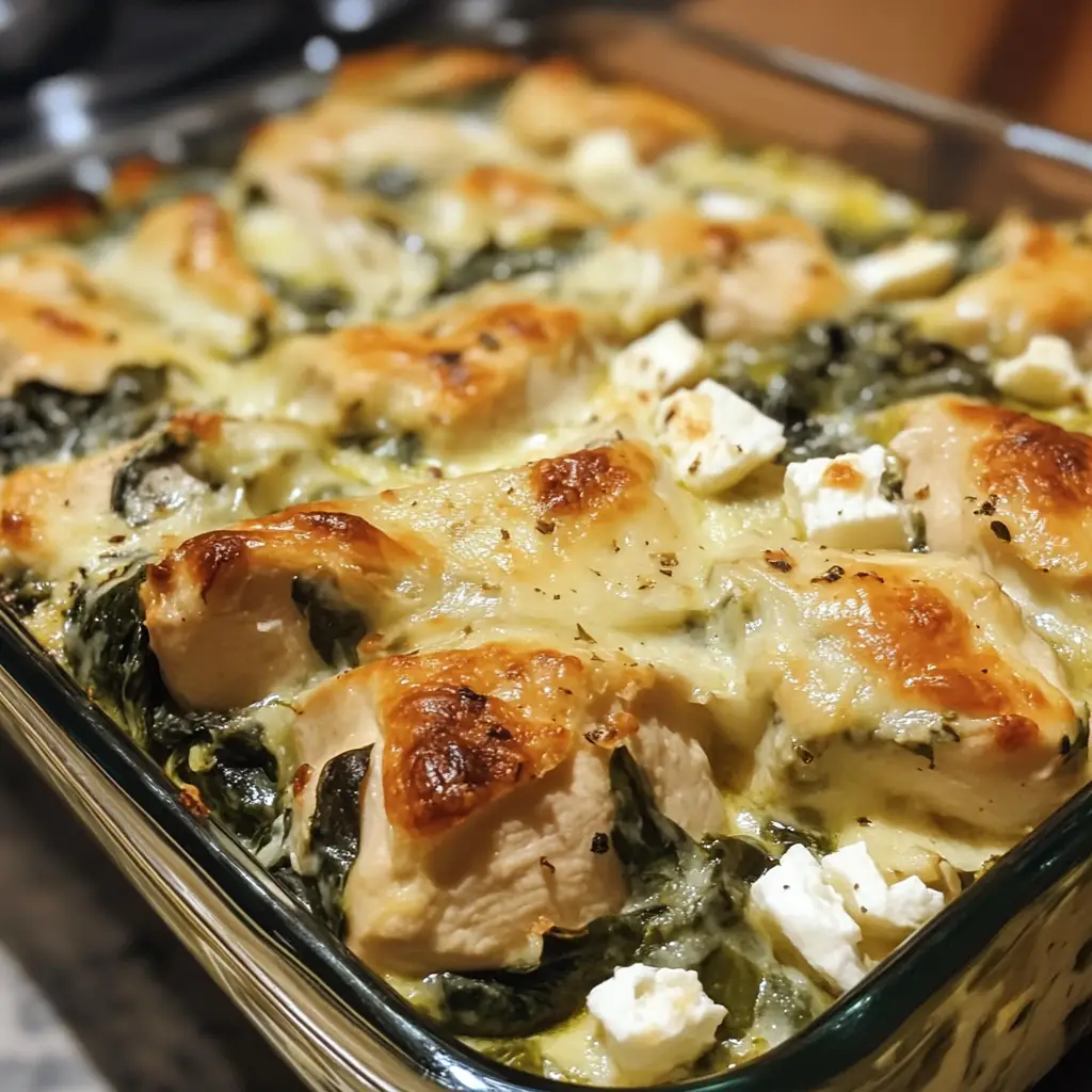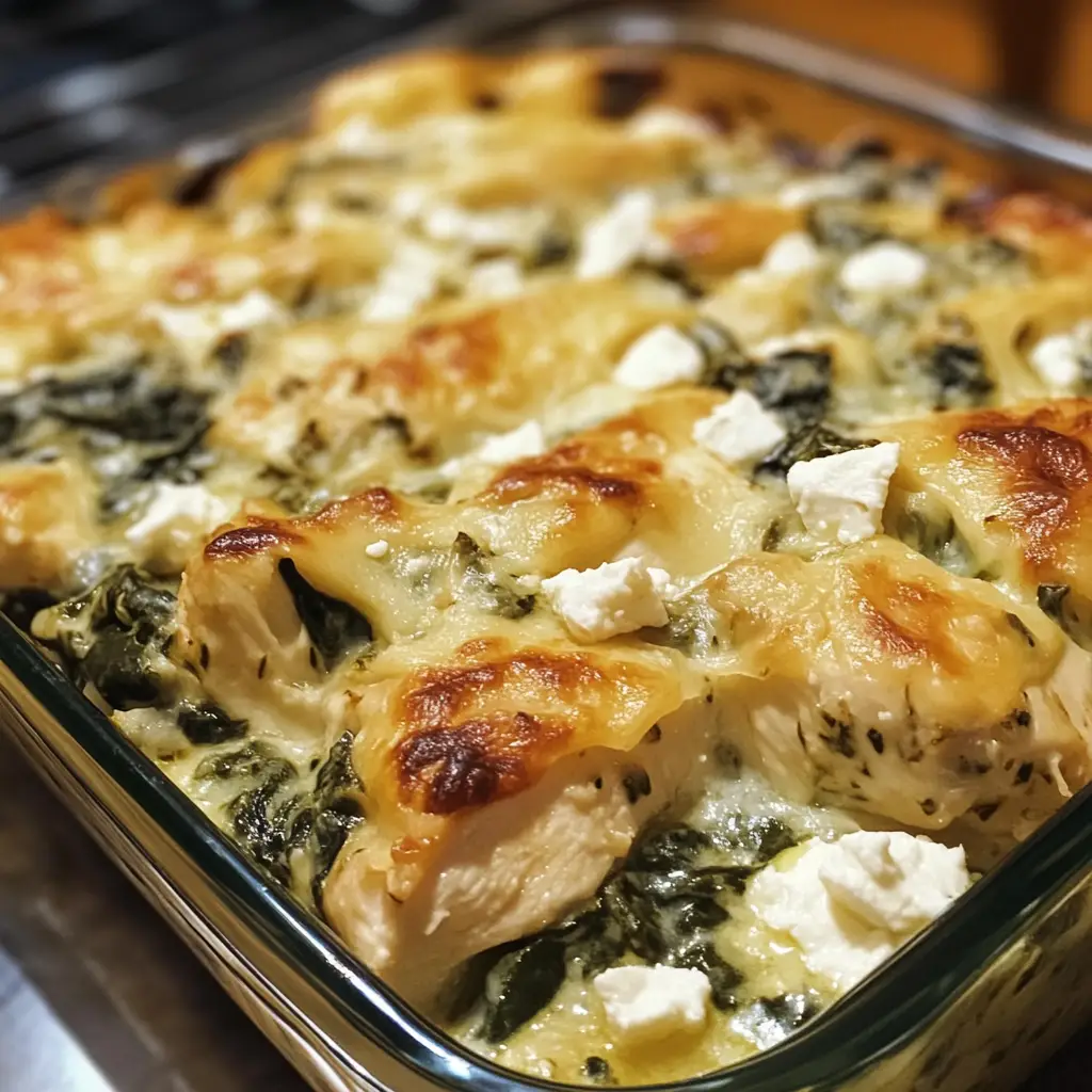 A delicious and creamy chicken bake featuring spinach and feta cheese, perfect for a comforting meal.