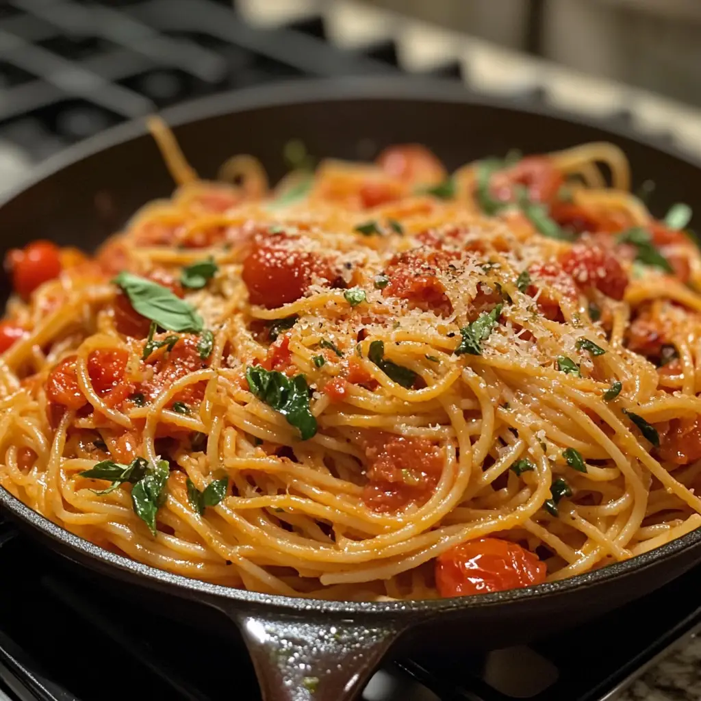 Now, it’s time to bring everything together. Add the drained spaghetti to the skillet with the tomato mixture. Toss everything gently to combine, ensuring the pasta is well-coated with the sauce. If it seems a bit dry, add a splash of the reserved pasta water to help it along.