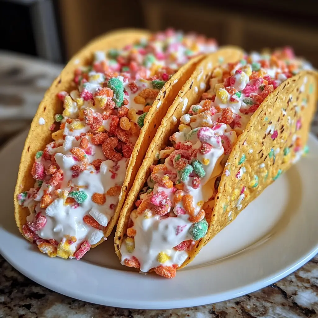 Q: Can I make these ahead of time? A: Yes, assemble the tacos and chill up to 24 hours before serving. Q: Can I freeze them? A: It’s not recommended, as the cereal may lose crunch. Q: Can I use other cereals? A: Yes, any crisp cereal will work, including Cocoa Pebbles or Rice Krispies. Q: Can I make smaller bite-sized tacos? A: Absolutely, just adjust the filling and toppings accordingly. Q: How do I prevent the shells from breaking? A: Ensure shells are fully cooled and handle gently when filling.