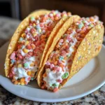 This recipe has taken the dessert world by storm because it combines several elements that are universally loved: cheesecake, crunchy cereal, and the playful taco format. The Fruity Pebbles add a burst of color and fun crunch, while the cheesecake filling provides a smooth, creamy balance that keeps every bite satisfying. It’s visually striking, making it a favorite for social media-worthy dessert tables. These tacos are also highly customizable, allowing bakers to adjust flavors, toppings, or shell types according to preference. The combination of familiar flavors presented in an unexpected way creates excitement and delight, making this dessert a must-try for anyone looking to wow their guests or indulge in a nostalgic treat.