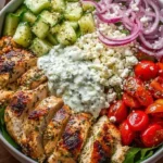 A vibrant Greek Chicken Bowl featuring marinated grilled chicken, fresh veggies, and a creamy tzatziki sauce, perfect for a healthful meal.