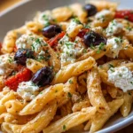 A vibrant and satisfying Greek pasta dish featuring creamy feta, juicy olives, and fresh vegetables, perfect for any occasion.