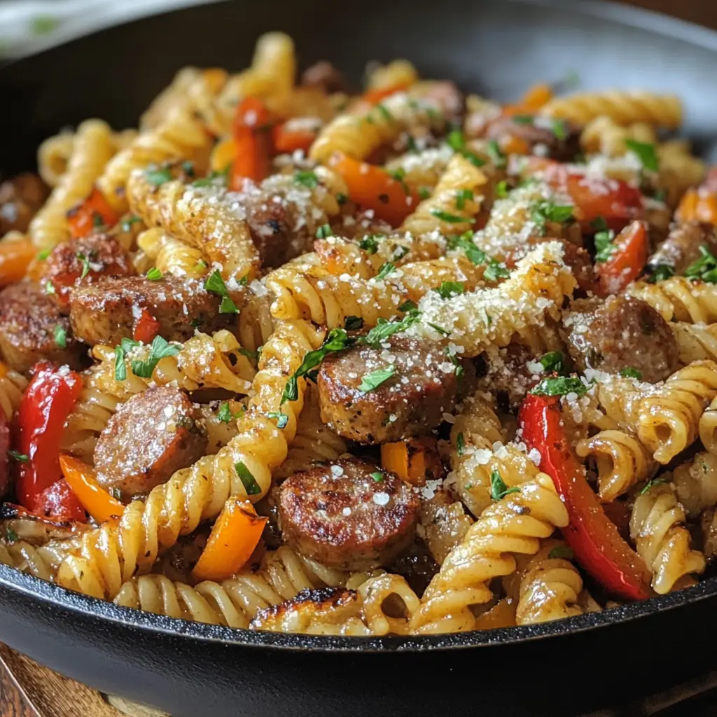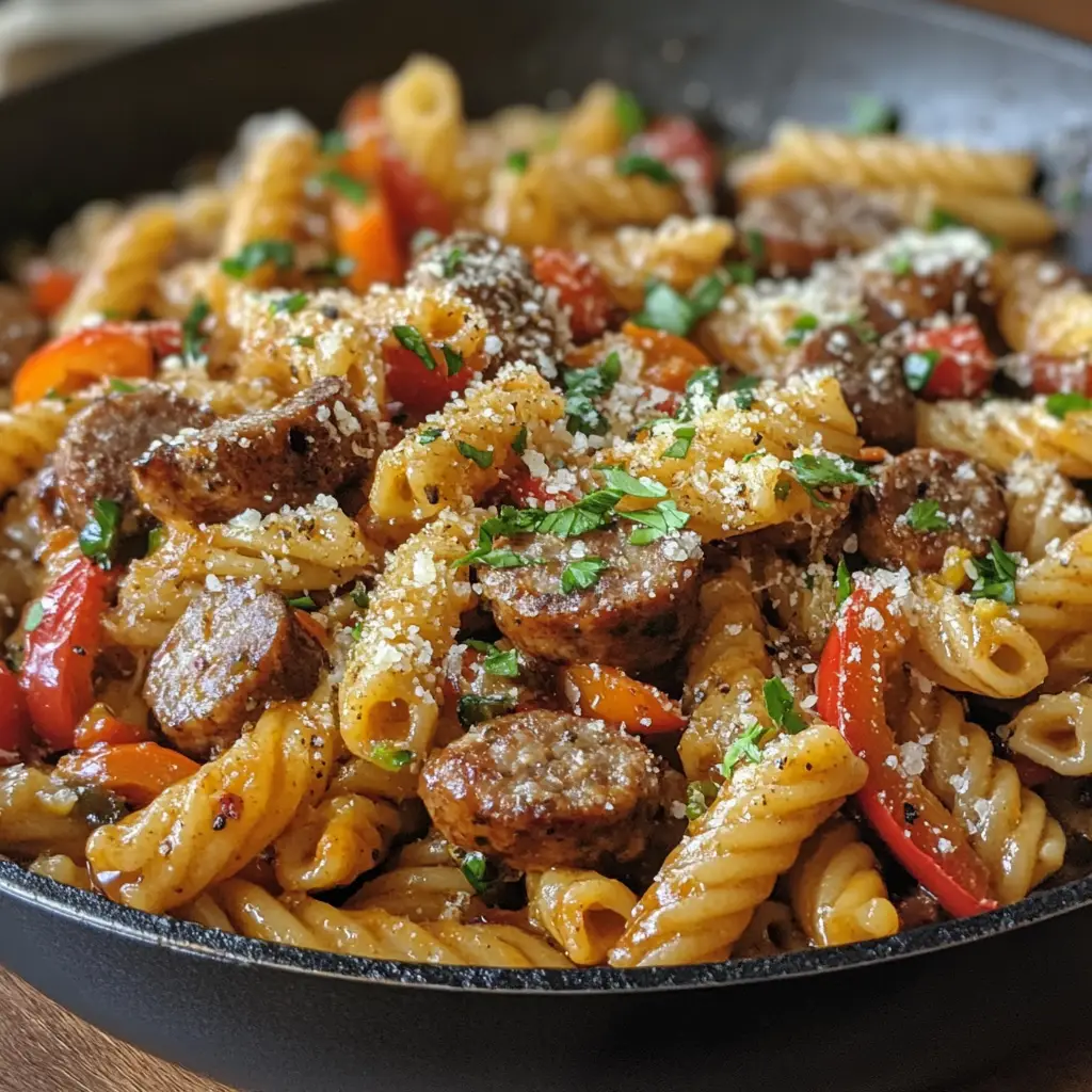 A quick and delicious one-pan meal featuring grilled sausage, colorful peppers, and pasta, perfect for busy weeknights.