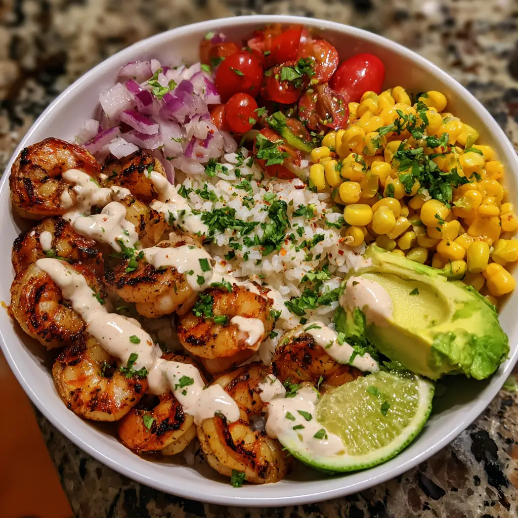 - Assemble the bowl by placing grilled shrimp on a bed of corn salsa and drizzling with creamy sauce.