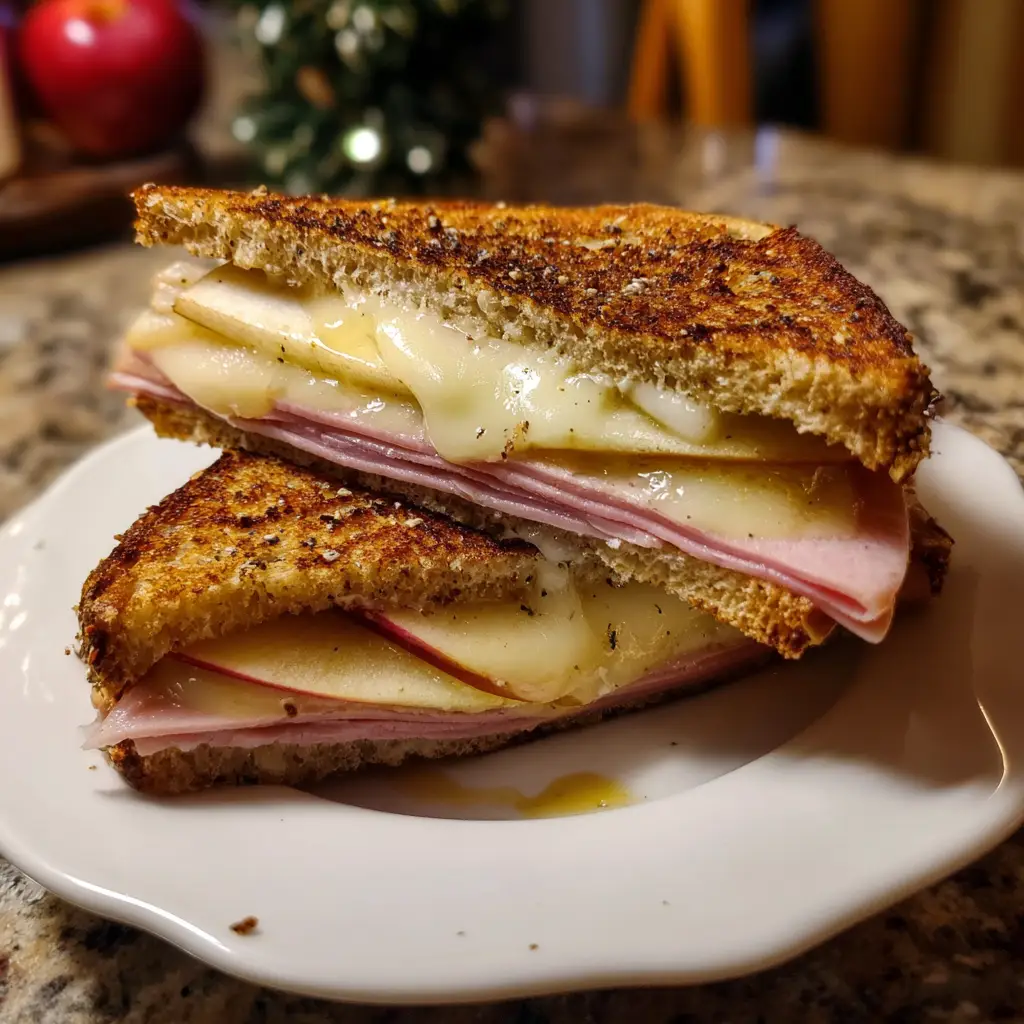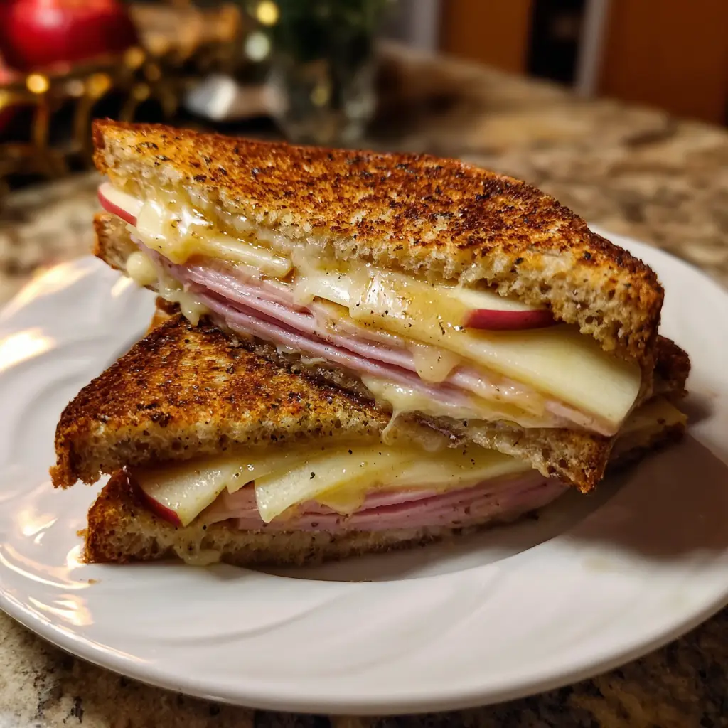 A delightful toasted sandwich featuring layers of ham, Swiss cheese, and fresh apple slices, perfect for a quick lunch or snack.