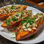 Finally, return the filled sweet potato boats to the oven for an additional 10 minutes. This step warms everything through and toasts the almonds just right. Keep an eye on them; you want the almonds to be golden but not burnt. When they’re done, take them out and let them cool slightly before serving. Your Honey Butter & Almond Sweet Potato Boats are ready to be enjoyed!