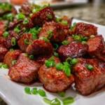 Once your steak bites are cooked to perfection, remove them from the skillet and place them on a serving platter. Now, for the finishing touch! Sprinkle chopped green onions over the top for a pop of color and freshness. These steak bites can be served as an appetizer or a main dish. Pair them with rice or steamed veggies for a complete meal. Enjoy every delicious bite!