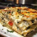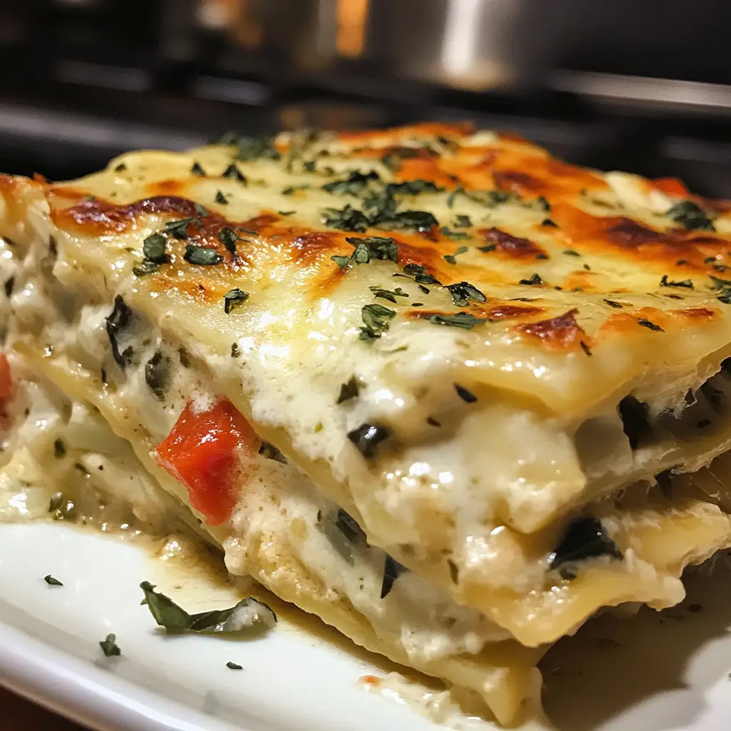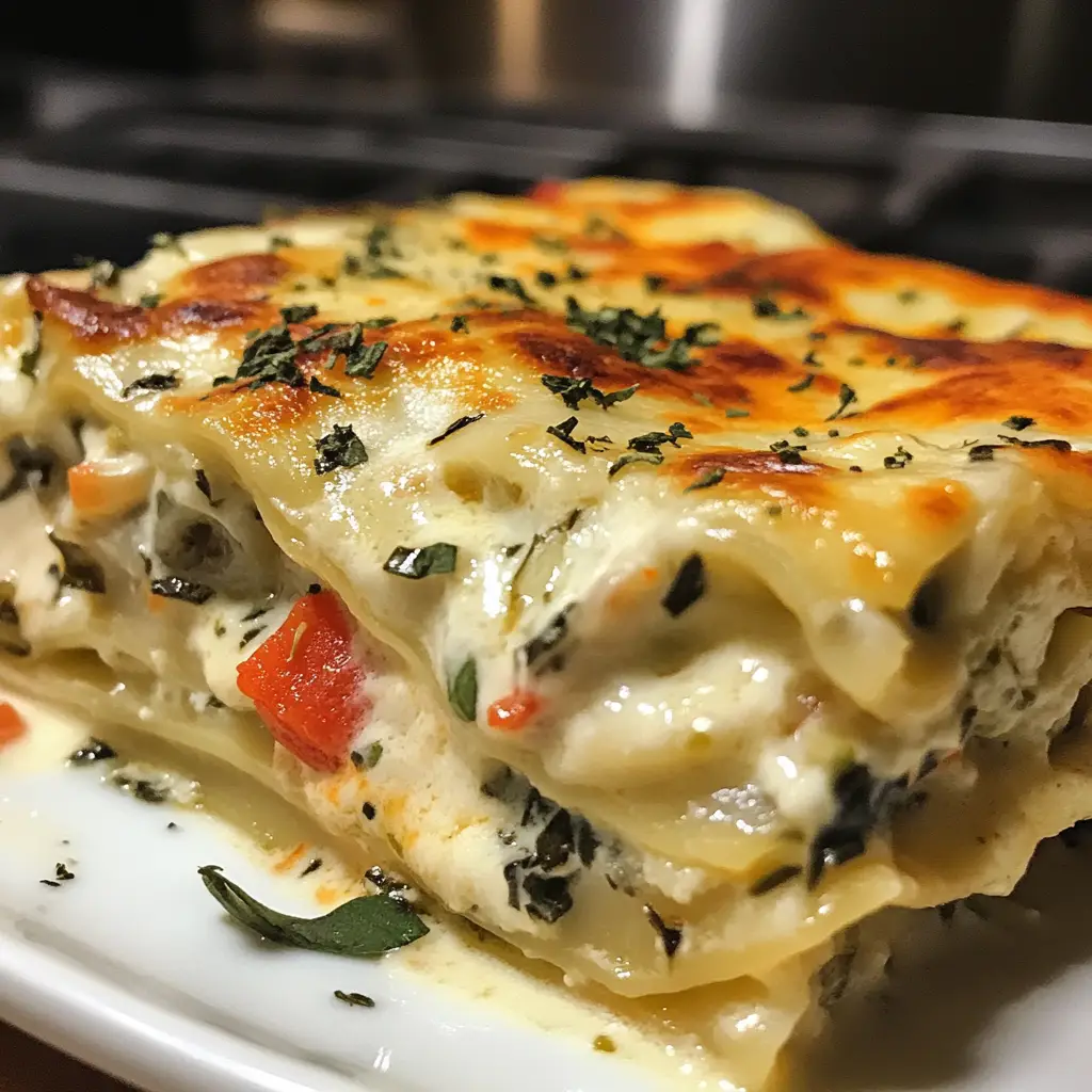 A creamy and delicious white lasagna packed with a variety of vegetables, perfect for a comforting meal.