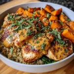 A comforting bowl featuring roasted sweet potatoes, juicy chicken glazed in maple and Dijon, served over quinoa.