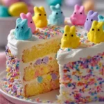 A delightful and colorful cake perfect for Easter celebrations, featuring a light yellow cake topped with creamy frosting and playful Marshmallow Peeps.