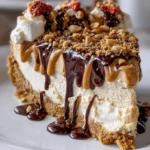This pie is not just a dessert; it’s a celebration of everything beautiful about rich flavors and texture. Each slice serves not only to satisfy a sweet tooth but also brings forth a sense of nostalgia, echoing those cherished moments spent with family and friends. You will find yourself captivated by the contrasting textures—the crunch of the graham cracker crust, the silkiness of the cheesecake filling, and the lightness of the whipped cream, all topped off with a drizzle of chocolate and a sprinkle of chopped peanuts.
