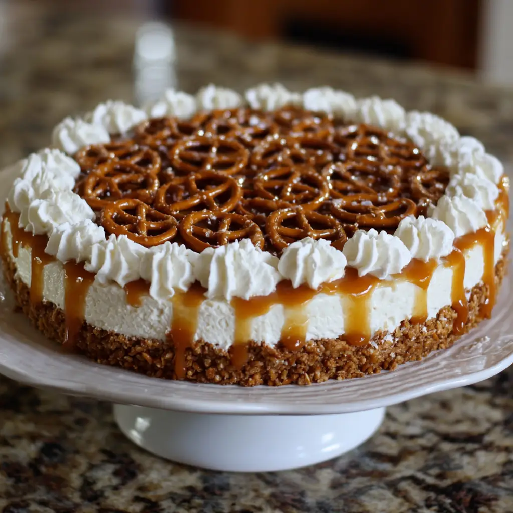 A delicious no-bake pie combining the sweet and salty flavors of caramel and pretzels, perfect for any dessert lover.