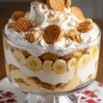 Picture this: layers of luscious banana pudding cascading over crisp, peanut-buttery cookies, interspersed with fresh banana slices. You can almost hear the delicate crunch as you scoop a perfect bite, the smoothness of cream melting alongside the sweetness of ripe bananas, creating a blissful harmony that dances across your palate. Each spoonful offers a nostalgic nod to childhood treats while still feeling indulgent enough to serve at a dinner party. This trifle isn’t just a dessert; it’s a sweet moment, ready to be shared and savored.
