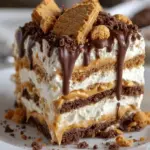 A no-bake dessert featuring layers of graham crackers, creamy peanut butter mixture, and whipped cream, perfect for a sweet celebration.