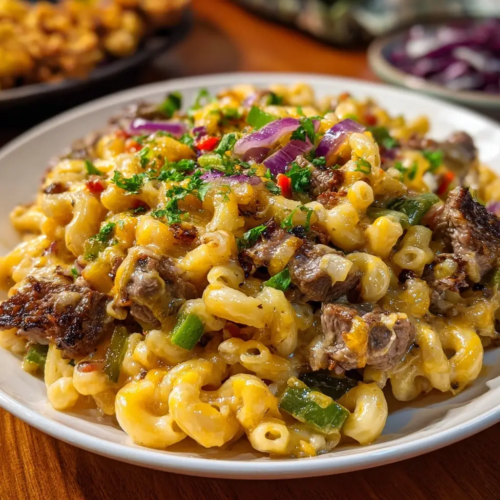 A delicious fusion of classic Philly cheesesteak and creamy mac and cheese, perfect for a comforting meal.