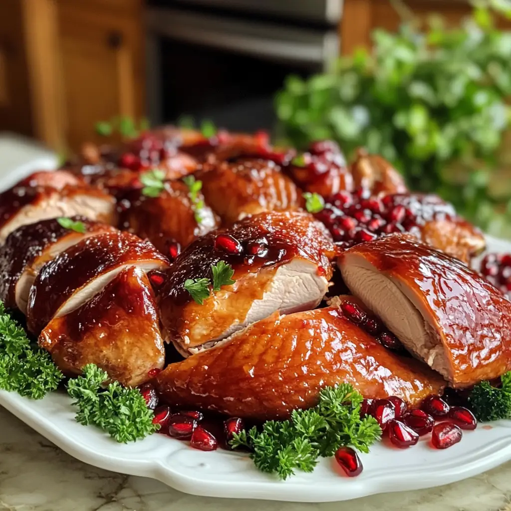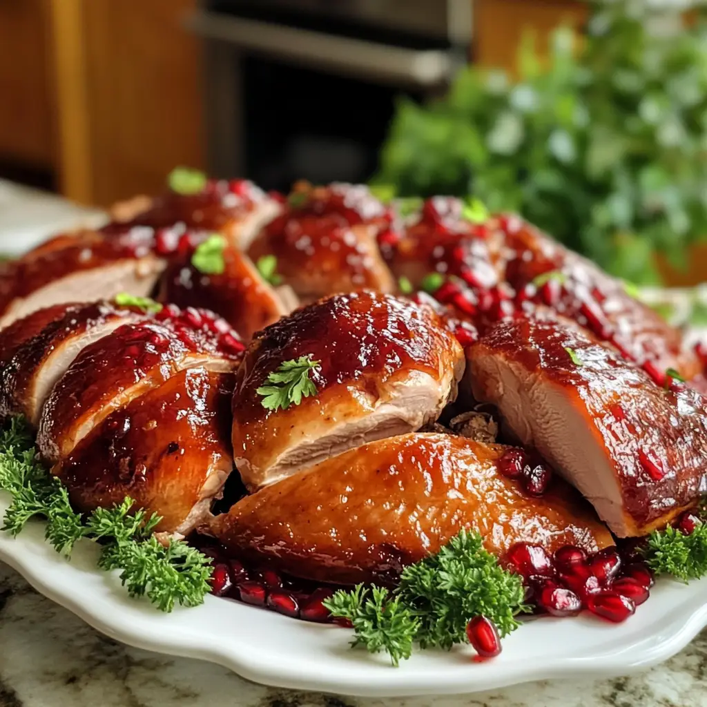 A delicious and festive roast turkey glazed with a sweet and tangy pomegranate sauce, perfect for holiday feasts.