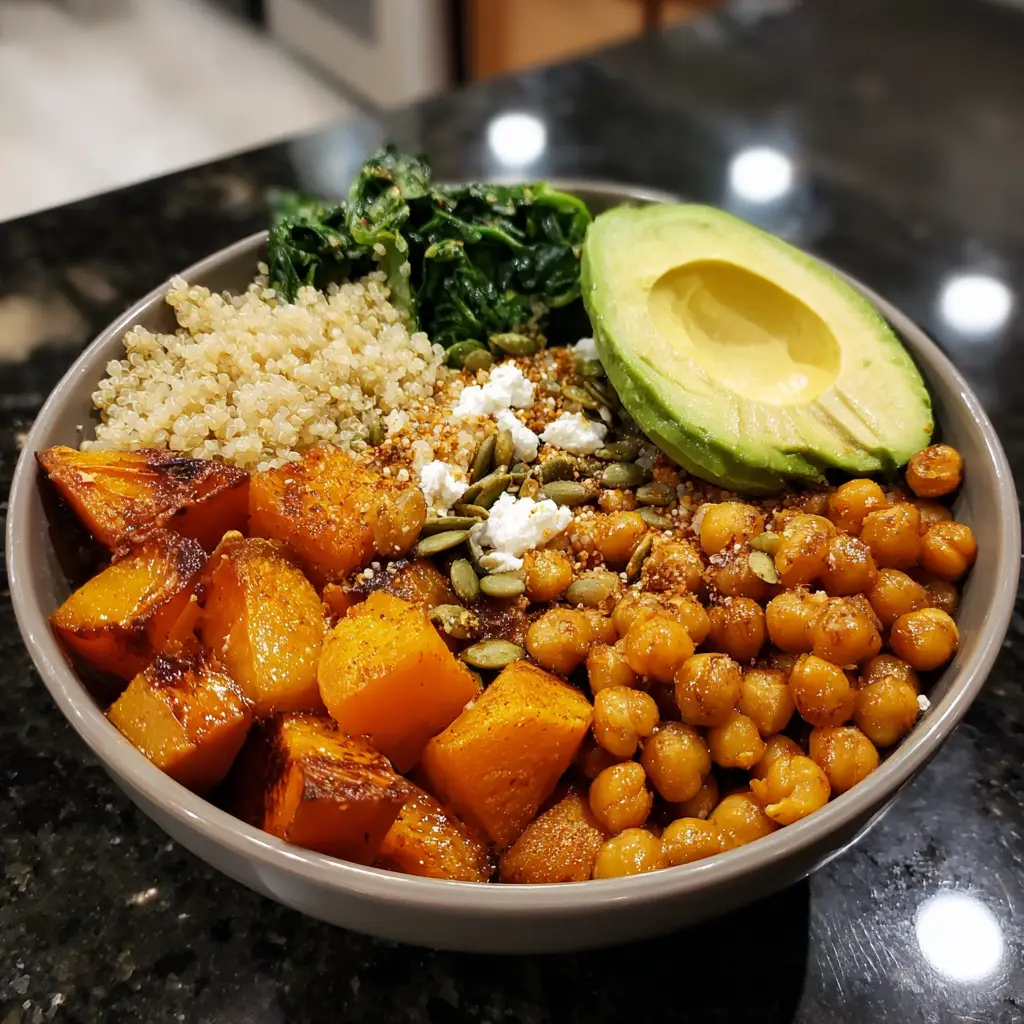 A nutritious and flavorful power bowl combining pumpkin and chickpeas, perfect for a healthy meal.