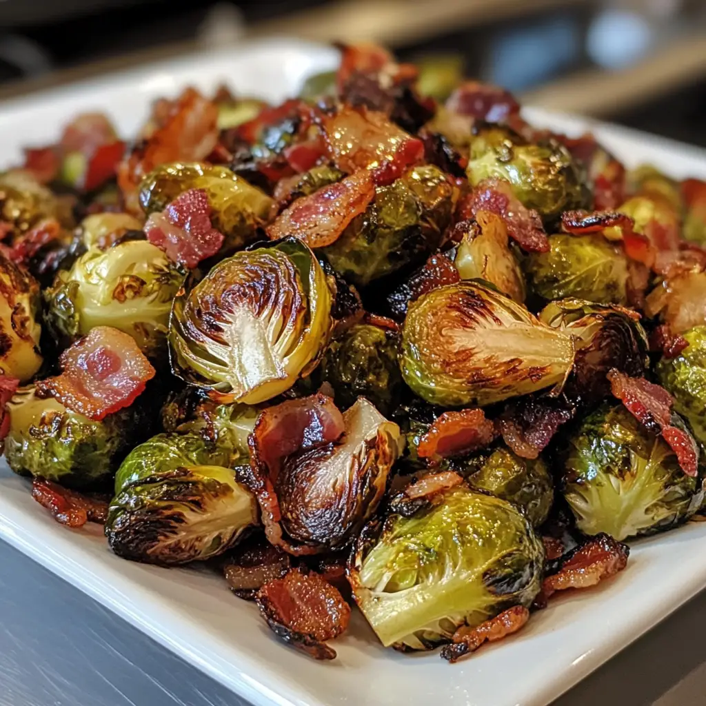 A delicious and savory dish combining roasted Brussels sprouts with crispy bacon and a tangy balsamic glaze.