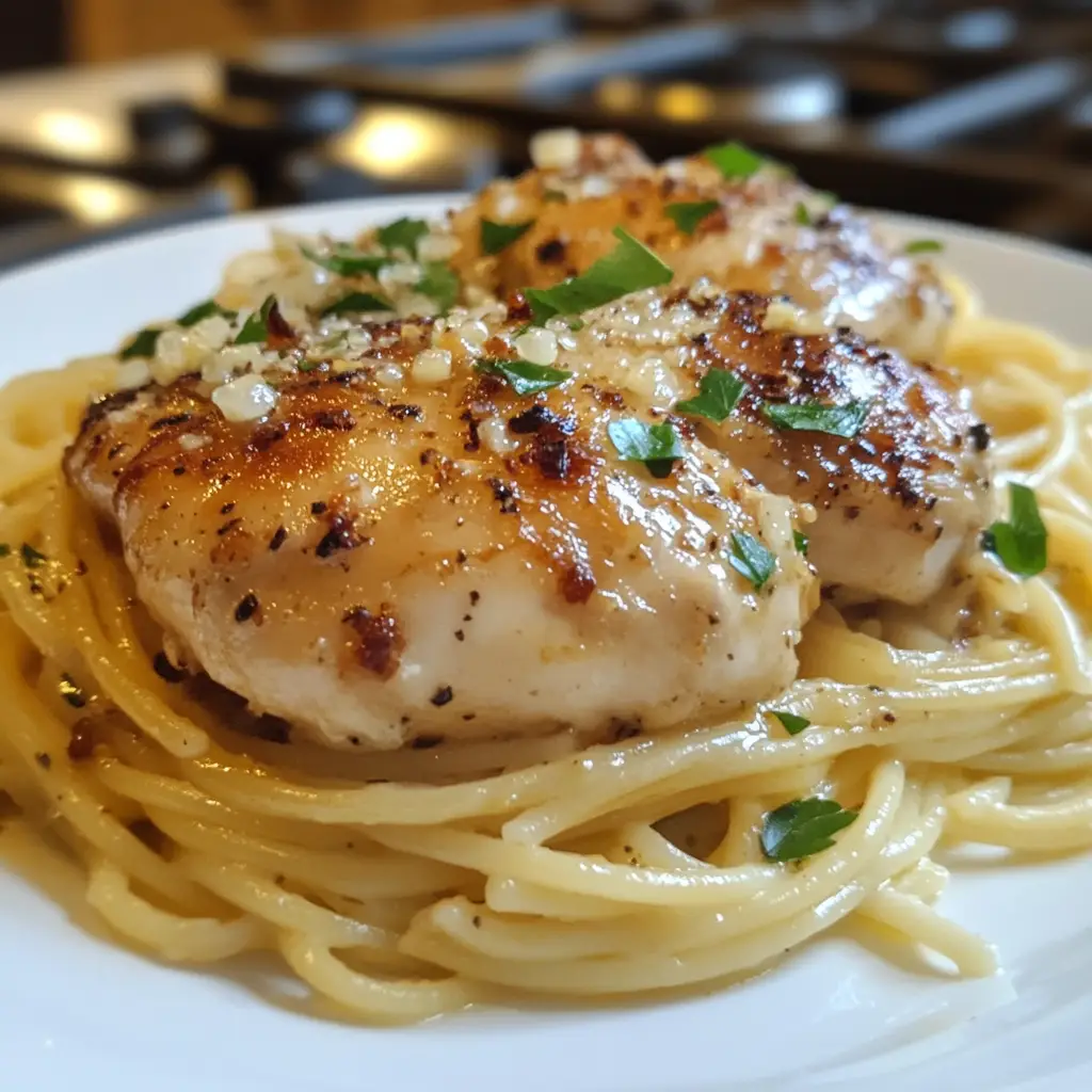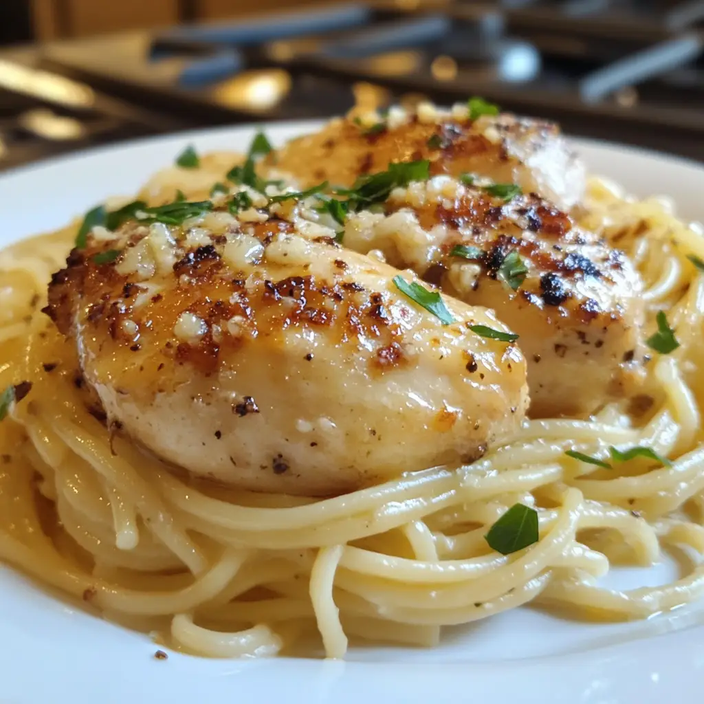 A delicious and easy-to-make slow cooker dish featuring tender chicken, garlic, and creamy Parmesan cheese served over pasta.