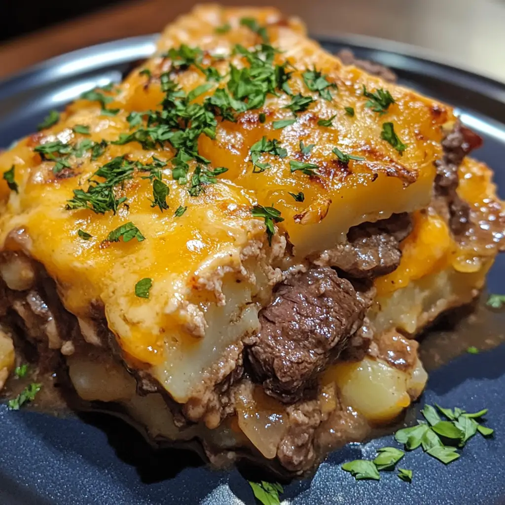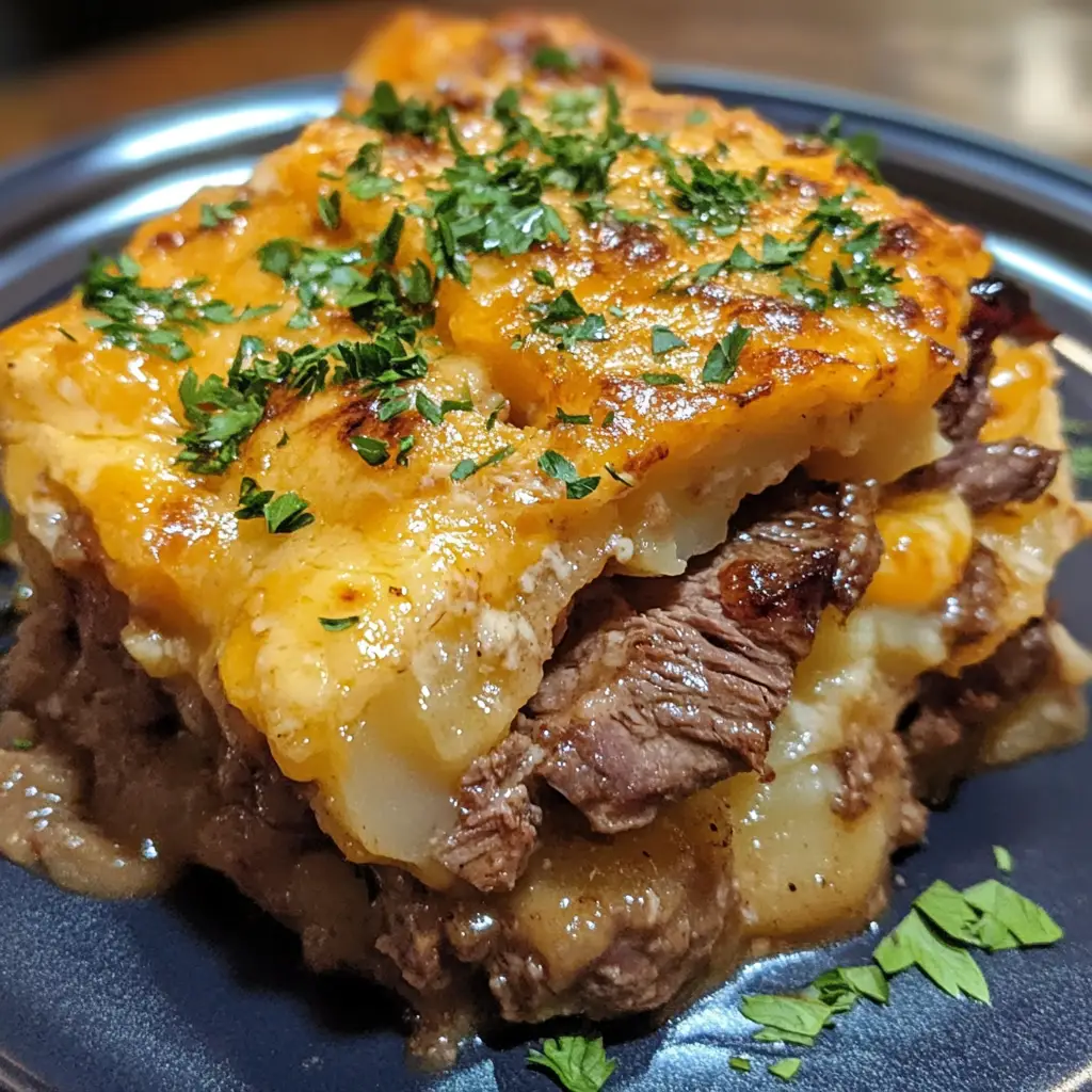 A delicious and hearty slow cooker casserole featuring tender steak, creamy cheddar cheese, and flavorful potatoes, perfect for a comforting meal.