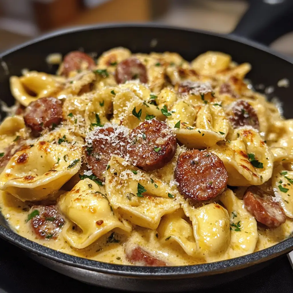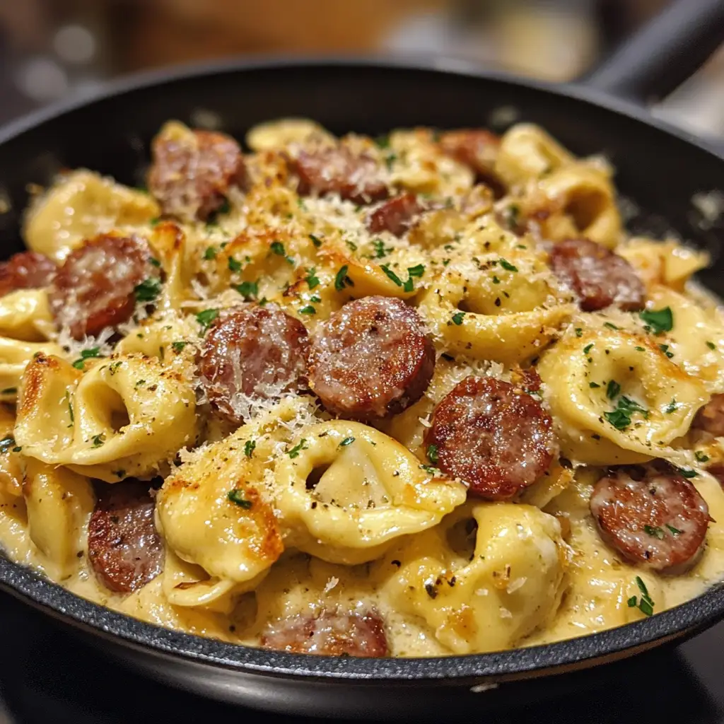 A creamy and delicious dish featuring smoked sausage and tortellini in a rich Alfredo sauce.