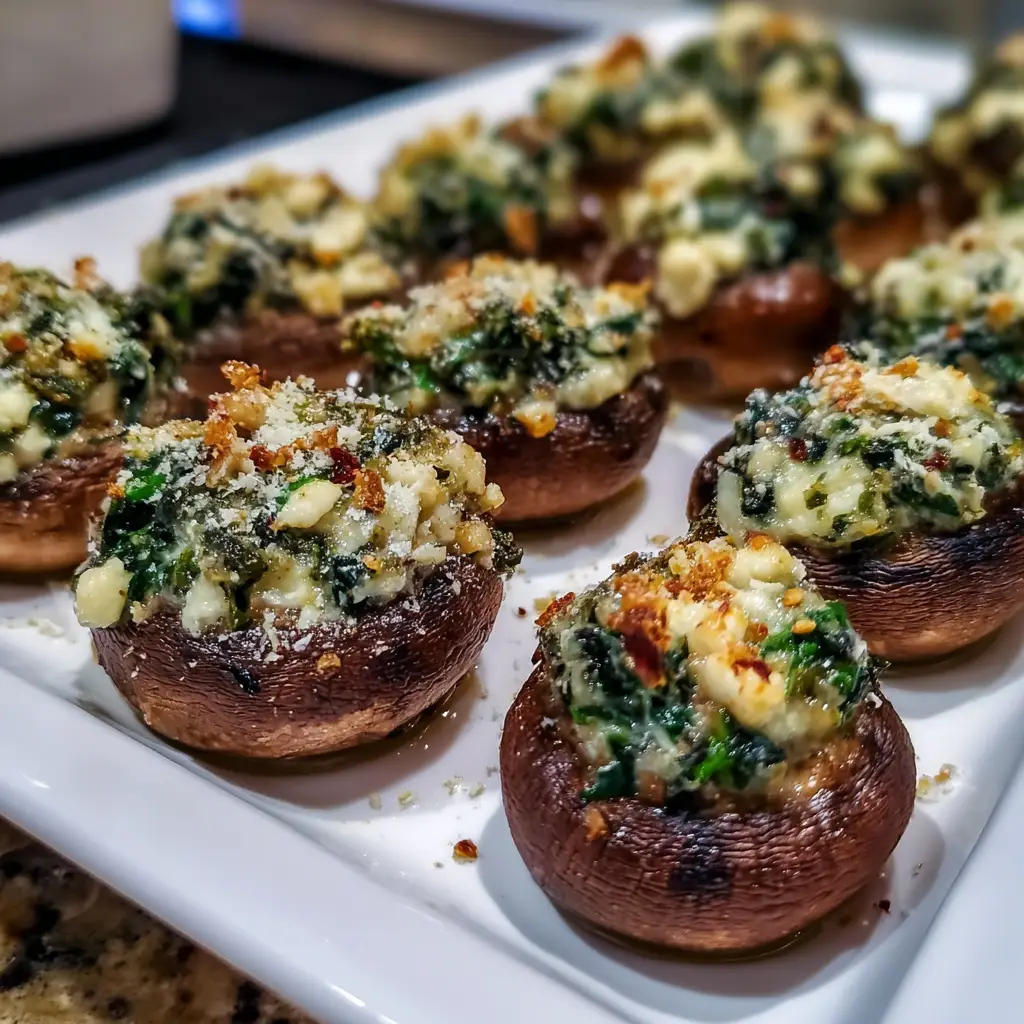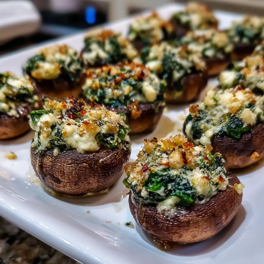 Delicious cremini mushrooms stuffed with a creamy spinach and ricotta filling, perfect as an appetizer or side dish.