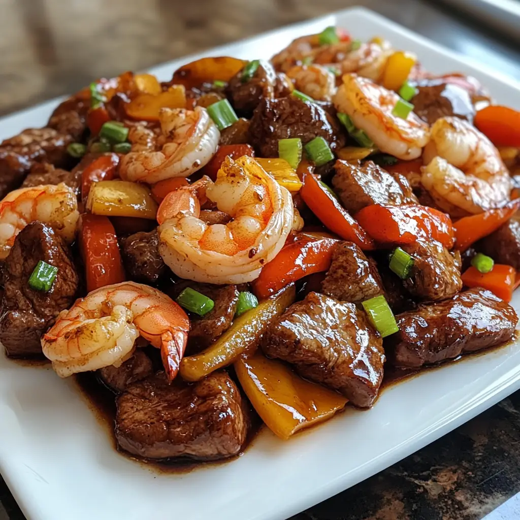 A quick and delicious stir fry featuring tender steak and succulent shrimp, perfect for a weeknight dinner.