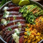 Indulging in this delicious bowl goes beyond mere nourishment—it becomes a celebration of fresh, vibrant ingredients that work harmoniously together. The star of the show, the flank steak or ribeye, brings a robust depth of flavor, enhanced beautifully by a blend of spices that coat it perfectly during cooking. Then, the roasted corn adds a sweet crunch, balancing the richness of the meat and creamy avocado. Every bite dances on your tongue, while the cilantro cream sauce introduces a lively kick, rounding out the experience elegantly.