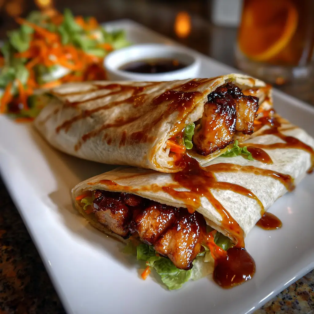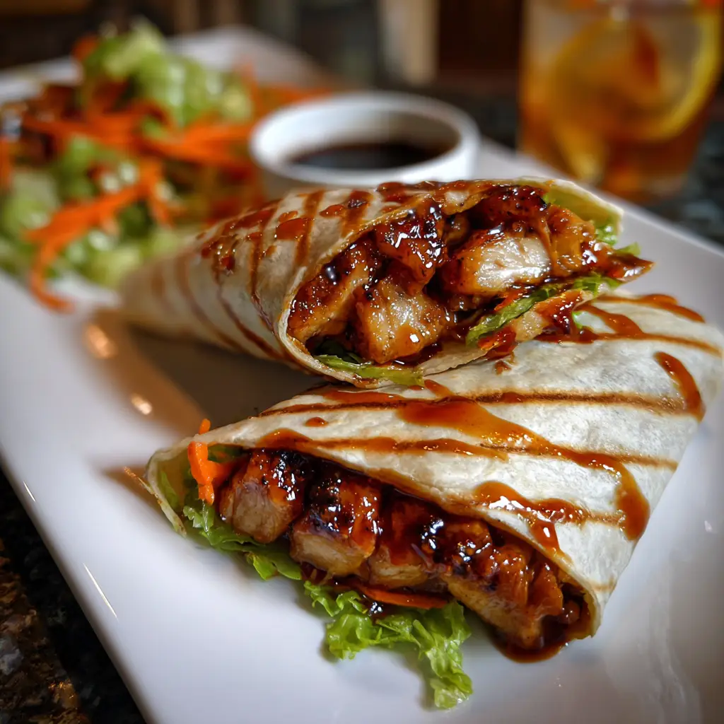 A delicious and easy-to-make wrap featuring tender chicken coated in a sticky soy sauce, perfect for a quick meal or snack.