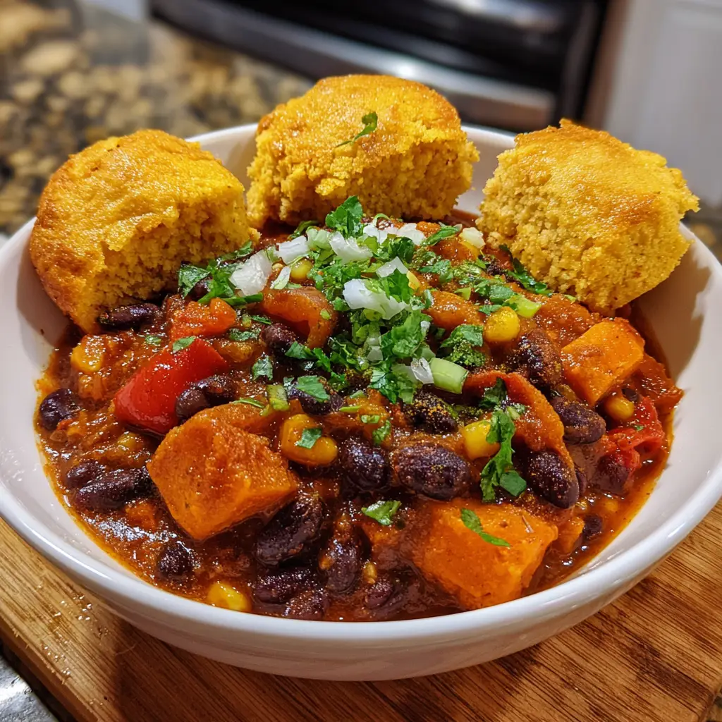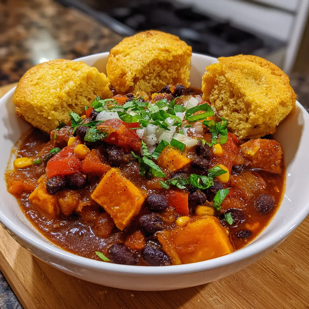A hearty and flavorful Sweet Potato & Black Bean Chili served with cornbread, perfect for a comforting meal.