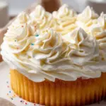 Whipped cream frosting on a vanilla cupcake with colorful sprinkles.